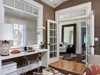 على سبيل المثال ، التصميم الداخلي مذهل بوجود باب مزدوج مع حواف بيضاء وزجاج مصنفر مقسّى. يوفر هذا الباب تباينًا مشرقًا وجذابًا للجدران ذات اللون البني ، ولكنه يتوافق أيضًا مع الألواح العريضة البيضاء والتركيبات الكهربائية والأثاث بتشطيبات بيضاء. نظرًا لأن إطار الباب والقالب فوقه أبيضان أيضًا ، فإنهما يجمعان بشكل متناغم الأبواب وسطح السقف..