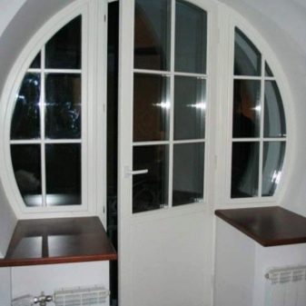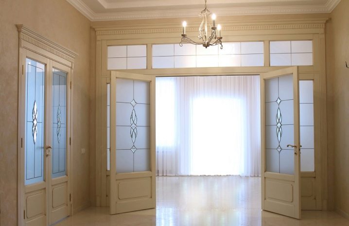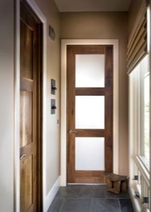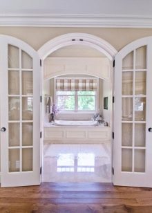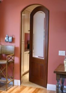 في هذه الحالة ، اختر الأبواب الزجاجية كليًا أو جزئيًا. يوسع الزجاج بصريًا مساحة المعيشة ويجعلها خفيفة. في كثير من الأحيان ، يتم عمل الفتحات على شكل قوس ، ثم يتم تقريب كل من اللوحة القماشية والمربع.