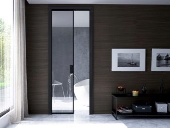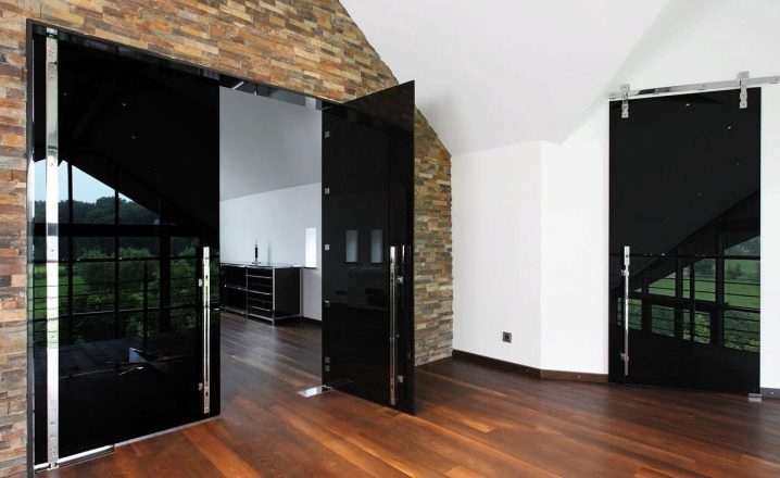 - أيضا عند إنشاء الأبواب يمكن استخدامها زجاج. يمكن أن يكون صلبًا ، ملونًا ، محكمًا ، غير لامع مع تأثير المرآة. جميع المنتجات ذات التشطيب الزجاجي أو الزجاج بالكامل تبدو باهظة الثمن وفاخرة. إذا تحدثنا عن زجاج بالكامل ، على سبيل المثال ، أبواب المدخل ، فبمساعدتهم يمكنك الحصول على منظر بانورامي ممتاز من المنزل..