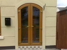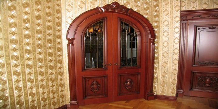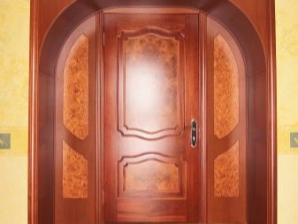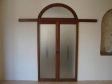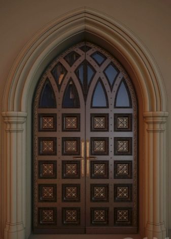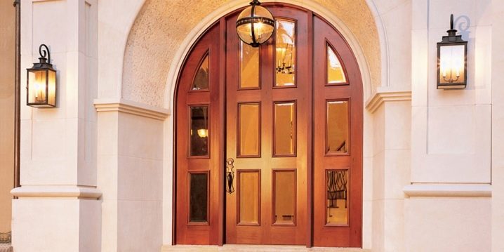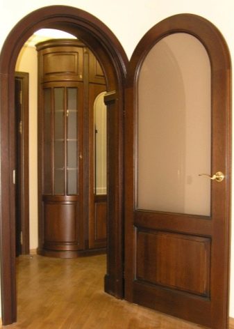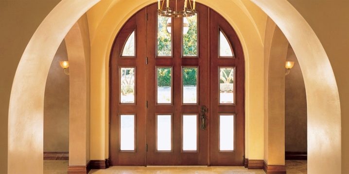تكمن ميزة التصميم في شكل المنتج والعارضة العلوية – لهما شكل مقوس ، وله عدد من المزايا. أهم ميزة لها هي مظهرها الرائع. خلاف ذلك ، لا تختلف في الصفات الإيجابية الخاصة عن الأبواب القياسية للمداخل المستطيلة..