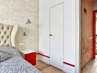- تحت الجدار. يمكن للباب أن يندمج تمامًا مع الداخل ، وهو مطلي بما يتناسب مع الحائط ، أو مبلطًا أو مُلصقًا بنفس ورق الحائط الموجود على الجدران ، ولن تضطر حتى إلى إنفاق أموال إضافية على أي عناصر تصميم. الشيء الوحيد الذي يجب أن تنتبه إليه هو المقبض. سيكون الحجم الكلاسيكي ملحوظًا جدًا ، ومن المقترح إيقاف انتباهك عن نفس مقابض الأبواب المخفية أو المسطحة التي تفتح الأبواب بنقرة واحدة ، أو الآليات الكهربائية.