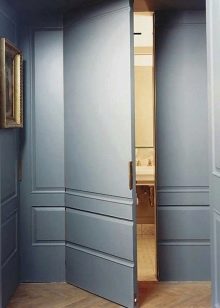 - تصميم سوينغ. الخيار الأرخص ، في الواقع ، هو باب متأرجح عادي ، أقل وضوحًا ، وأقل بروزًا من الحائط. لا يمكن إصداره إلا بمقبض أو قفل أو مخطط رفيع ملفت للنظر..