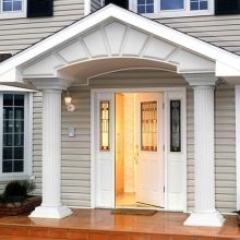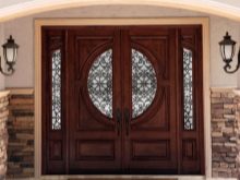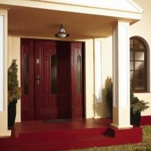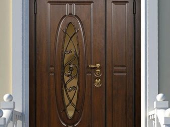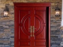 كقاعدة عامة ، يتم استخدام كتلة الخشب لهذا الغرض. تبدو أنيقة للغاية ومكلفة. علاوة على ذلك ، فإن أفخمها هو الهيكل ذو الضلفتين المثبت عند مدخل منزل خاص كبير. هذا النموذج المكون من صفحتين ضخم للغاية ويبدو فاخرًا ، مما يؤكد على المكانة الاجتماعية العالية لأصحاب المنزل..