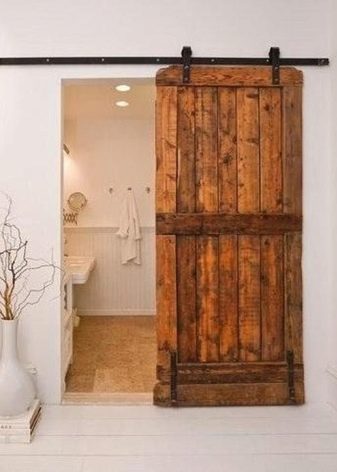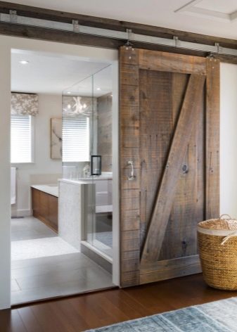 سيكون الباب الريفي ضخمًا وسميكًا ومصنوعًا من الخشب الخام. يجب أن تعلق على مفصلات ثقيلة. تستخدم اللوحات القماشية أو الألواح الضيقة المربوطة ببعضها البعض بقضبان معدنية. لا يوجد ديكور: ربما ألواح مثبتة أعلى اللوحة على شكل الحرف Z – في البداية يتم تسميرها هناك من أجل القوة.