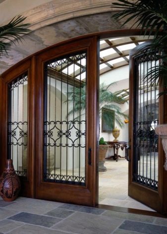 - شرقية. يرتبط هذا النمط بالدرجة الأولى بالغرابة. هنا ، يتم استخدام أقواس من نوع السهم ، والتي تكمل أوراق الباب. يتم استخدام أنواع الخشب الداكن فقط كأساس..