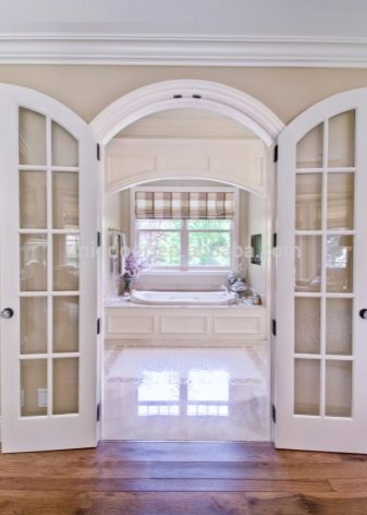 - زجاج. للحصول على أوراق الباب ، يتم استخدام أنواع صلبة فقط من هذه المواد. مثالية للحمامات لأنها تتحمل الرطوبة بسهولة.