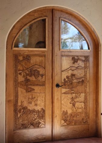 - قطع من قطعة واحدة. أحد أكثر الخيارات شيوعًا. يتم استخدام ورقة واحدة أو أكثر كقاعدة ، والتي تتساوى في الحجم مع أبعاد هيكل القوس أو الباب. ثم ، باستخدام أداة خاصة ، يتم إعطاء الشغل الشكل المطلوب. هذا النهج أساسي لإنتاج المنتجات الزجاجية. يفعلون نفس الشيء مع الخشب. للقيام بذلك ، يتم لصق العديد من الألواح معًا ، ثم يتم قطع قماش من الدرع الناتج باستخدام بانوراما.
