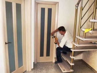 من الأفضل القيام بكل الأعمال بعد فك الباب من مفصلاته ووضعه على سطح أفقي مسطح. إذا لم يكن ذلك ممكنًا ، فمن الضروري فتح الباب وتثبيته بإحكام في الجزء السفلي حتى لا تتأرجح ورقة الباب أثناء التشغيل..