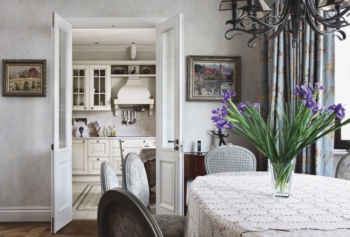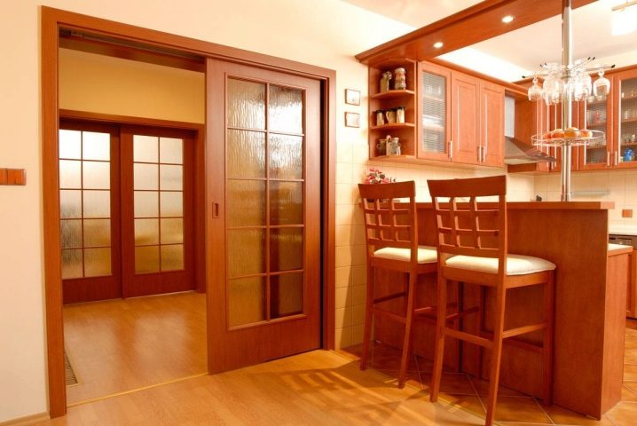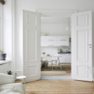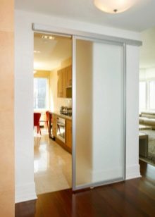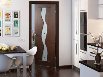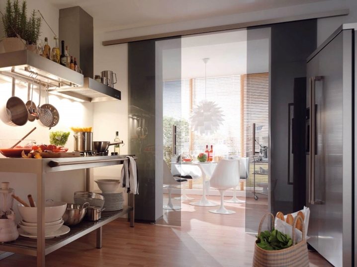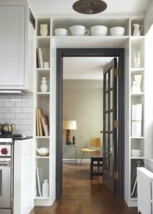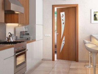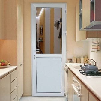 إذا كان باب المطبخ يؤدي إلى غرفة المعيشة أو غرفة الطعام ، فمن الأفضل اختيار هيكل متأرجح أو منزلق أو قوس – سيوحد الغرف. يمكن أن يكون قسمًا زجاجيًا خفيفًا ، وبابًا واسعًا ، ولوحة قماشية جميلة بالزجاج.