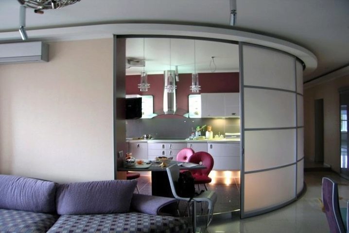 إنه يشبه باب الحجرة ، فقط “يسير” ليس على طول القضبان المستقيمة ، ولكن على طول القضبان الشعاعية. عادة ما يتم وضع اللوحات الشعاعية في شقق مصممة بعد التخطيط ، لأن هذه اللوحات تتطلب مساحة إضافية للفتح وتشغل مساحة أكبر من تلك الكلاسيكية المنزلقة..