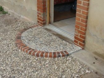 من الأفضل عمل خيارات دخول من أكثر المواد متانة. باستخدام الطوب والخرسانة ، يمكنك عمل عتبة للباب الأمامي. نظرًا لأن الخرسانة مادة سائلة ، فمن الضروري عمل قوالب صب لها (من ألواح قديمة أو غير ضرورية) ، والتي سيتم لاحقًا تثبيتها بالتركيب. مع هذا النهج ، لن تبرز من المنظر العام لفتح الغرفة..