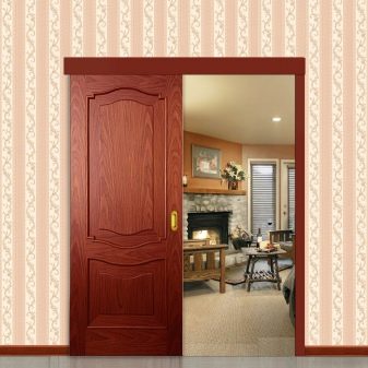 الخطوة الأخيرة هي تثبيت شريط علوي مزخرف يخفي الأخشاب والقضبان. بعد ذلك يتم إرفاق الألواح الخشبية. نظام الانزلاق الذي يتراجع إلى جدار محدد ومعقد. في مرحلة التشطيب الخام ، يتم بناء جدار زائف وتثبيت شعاع بقضبان توجيه. يتم أخذ عرض الفتح المستقبلي وطوله في الاعتبار من أجل الحركة السلسة للباب داخل الهيكل. يتم إرفاق اللوحة القماشية نفسها في المرحلة الأخيرة بعد لصق ورق الحائط ووضع الأرضية.