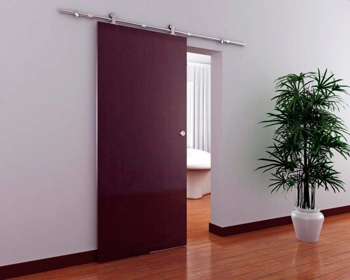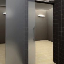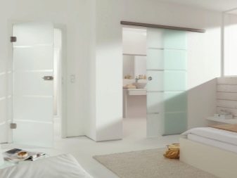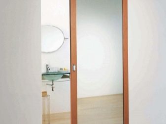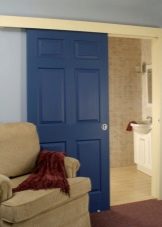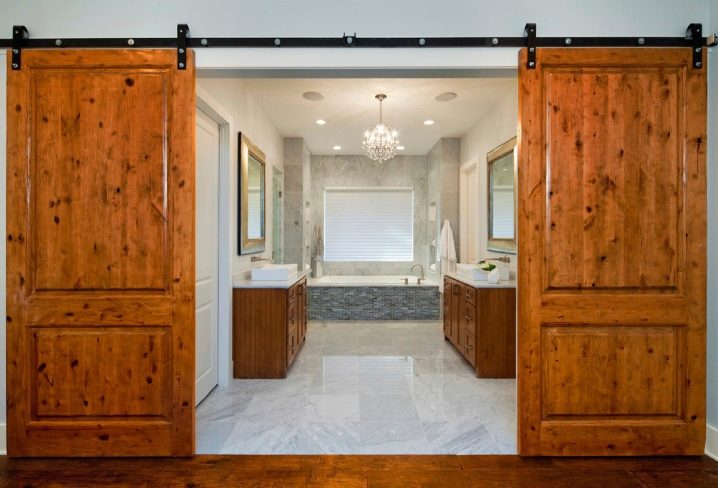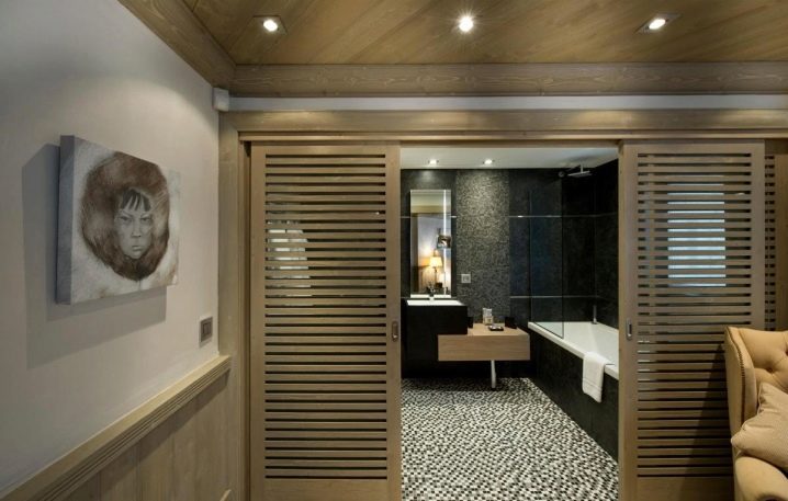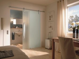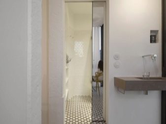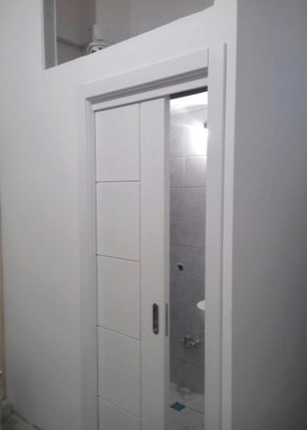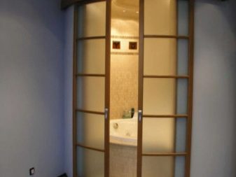 - حجرة. يمكن أن تكون الأبواب المنزلقة للحمام والمرحاض ذات ورقة أو اثنتين. تتحرك هذه الهياكل بالتوازي مع الجدران ، وتستخدم الأدلة لهذا الغرض. تتباعد أوراق الأبواب المزدوجة في اتجاهات مختلفة عن بعضها البعض.