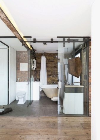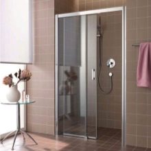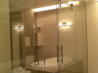 - هيكل زجاجي منزلق في صورة معدنية. هذا مثال حقيقي للرفاهية والنعمة. يتكون الباب من لوحتين شفافتين بحجم كبير. إنه يؤكد تمامًا على النمط العام وخفة الغرفة بأكملها ، لكن هذا النموذج مناسب فقط للشقق الفسيحة. بالإضافة إلى ذلك ، لن يقدر الجميع الأبواب الشفافة في الحمام..