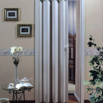 يمكن أن تقف الأبواب أيضًا من ورقة واحدة أو أكثر ، وهي مصنوعة من عدة شرائح عمودية ضيقة ، متصلة ببعضها البعض باستخدام مثبتات موثوقة. يتم طي نماذج الأبواب هذه على جانب واحد من الفتحة ، وبالتالي تشغل جزءًا من المساحة الحرة. نظرًا لأن سمك اللوحات صغير نوعًا ما ، فلن تكون هذه الحقيقة عيبًا كبيرًا بالنسبة لك..