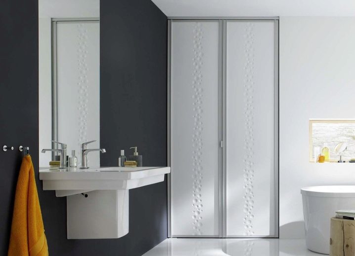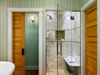 هناك متطلبات خاصة لتصميمات الحمامات. يجب أن تكون أوراق الباب مقاومة للتآكل والرطوبة العالية. نحن ندرج المواد الأكثر شيوعًا التي تصنع منها الهياكل المنزلقة الحديثة لمثل هذه المباني:
