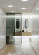 - زجاج. يعتبر الزجاج المقسّى ، من حيث خصائص الأداء ، مثاليًا للتركيب في الحمام. إنه شديد التحمل ومقاوم للأحمال الثقيلة اليومية. بالإضافة إلى ذلك ، لا تضر الرطوبة بهذه المواد على الإطلاق ، وهو أمر مهم للغاية.