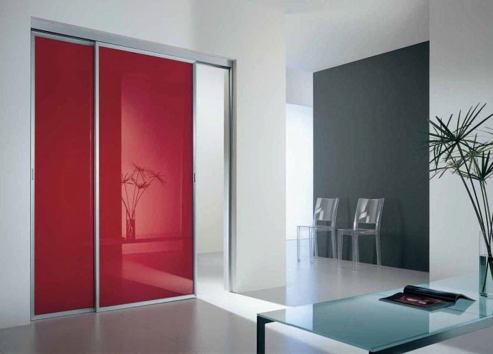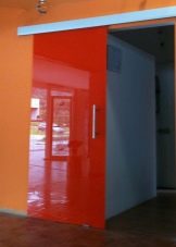 - باب جرار أحمر أنيق. يتكون هذا النموذج من لوحين من قماش أحمر لامع. هذا الخيار مثالي للشقة المصممة ، وسيصبح الزخرفة الوظيفية.