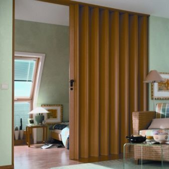 مبدأ حركة هذه الأنواع من أبواب المقصورة بديهي من الاسم. نظرًا لخصائص الطي ، فإن هذه الأبواب هي الأكثر إحكاما ومتواضعة للاستخدام والصيانة ، فهي تشغل الحد الأدنى من المساحة ، حتى لو كانت تغطي معظم المدخل. العيب الوحيد لهذه المنتجات مشاكل الضوضاء وعزل الرائحة, وهو مناسب عندما يتعلق الأمر بمنطقة المطبخ. ولكن كعنصر زخرفي أو عنصر تقسيم المناطق ، لا يمكن الاستغناء عنها..
