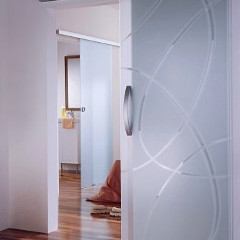 - نسيج الزجاج. لا يتم تضمين الأبواب المصنوعة من الزجاج ببساطة في مجموعة منفصلة. من الصعب دمجها مع زخرفة الأرضية أو الجدران ، لكنها في نفس الوقت تتناسب بشكل مثالي مع ديكور الغرفة وملمسها ومجموعة ألوانها..