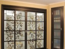 تتنوع الأبواب المنزلقة ليس فقط في ميزات التصميم الخاصة بها ، ولكن أيضًا في الأسلوب والتصميم. تستخدم تقنيات ومواد مختلفة لتزيينها:
