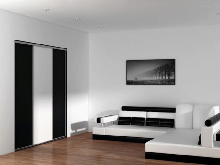تتلاءم الأبواب الانزلاقية بالأبيض والأسود المتحدنة تمامًا مع التكوين الأيديولوجي للديكور الداخلي الحديث البسيط.