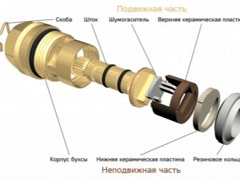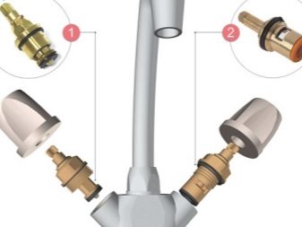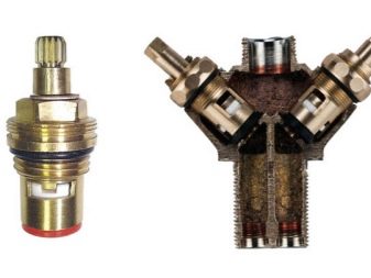 الصمامات هي المكونات الرئيسية لهذه الخلاطات. كل واحد منهم عبارة عن صندوق محور الرافعة ، والذي يمكن أن يكون من نوعين: دودة وسيراميك. يعتمد النوع الأول من العمل على الحركة الترددية للقضيب. يعتمد عمل النوع الثاني على لوحين خزفيين بهما فتحات أحدهما متحرك. عندما تتم محاذاة هذه الثقوب ، يظهر ممر للماء..