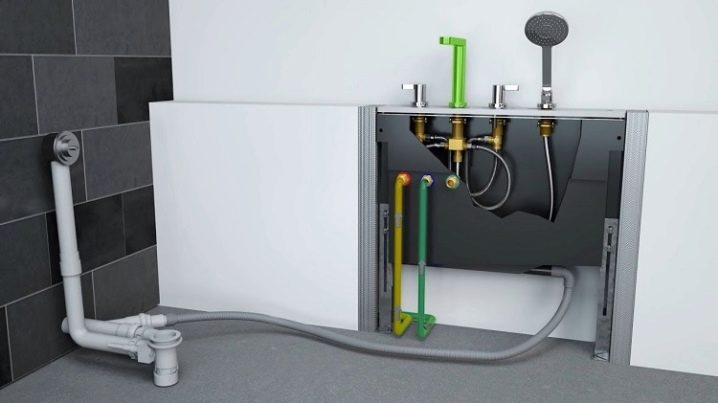 هناك طريقة أخرى للتثبيت دون الحاجة إلى عمل ثقوب في الحمام نفسه وهي ترتيب كل شيء على الحائط. بعد ذلك ، يجب إخفاء كل ما يتم إخفاؤه عادةً تحت الحمام تحت لوحة زائفة على الحائط. اللوحة الخاطئة عبارة عن زخرفة على جدران الحمام أو المطبخ ، يتم تحتها إخفاء الاتصالات المختلفة. قد تحتاج إلى عمل منافذ في الحائط من أجل وضع الأنابيب وجزء مخفي من الخلاط فيها. ستحتاج أيضًا إلى التفكير مليًا في موقع جميع الأنابيب. مزيد من التفاصيل موصوفة في التعليمات المرفقة بكل خلاط في المجموعة..