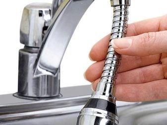الشيء الثاني الذي يجب الانتباه إليه هو التثبيت على صنبور الصنبور. يمكن أن يكون الجهاز بخيط خارجي أو داخلي ويتم تحديده اعتمادًا على خيط الخلاط نفسه. أخيرًا وليس آخرًا ، هو توافر ميزات إضافية. ستبدو الهواية ذات الإضاءة الخلفية جيدة في الحمام ، وفي المطبخ ستسعد أي ربة منزل بجهاز مرن يسمح لك بغسل أكبر قدر في الحوض بشكل مريح..