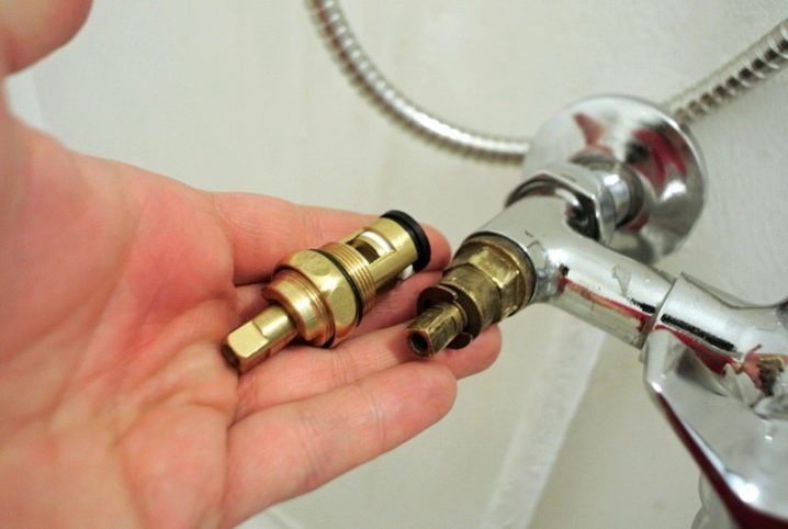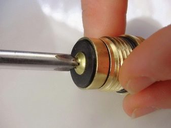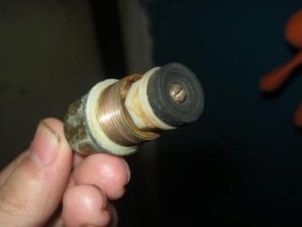 ثم قم بفك الجذع بإدخال مطاطي وفحص الصمام بالقرب من قاعدة الخلاط. إذا تم العثور على مقياس أو عيوب أخرى فيه ، فيجب تنظيفها ، وبعد ذلك يمكنك استبدال الحشية بأخرى جديدة وتثبيت الصنبور مرة أخرى.