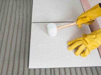 - بعد ذلك ، قم بلصق البلاط على طول الخط المحدد. حاول لصق العناصر ببعضها البعض بإحكام قدر الإمكان ، وإلا فقد تم تصميمها في الأصل على أنها أرضية غير ملحومة ، على العكس من ذلك ، قد تظهر مع طبقات ، علاوة على ذلك ، في أكثر الأماكن غير المناسبة.