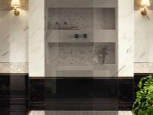 أيضًا ، في مناطق الحمام ، يمكنك وضع المنتجات بلون أبيض ثلجي. من الأفضل اختيار مثل هذا البلاط بنسيج خشن خفيف. من الأفضل تكديس هذا النوع من المواد في صف واحد. من الممكن أيضًا وجود إدخالات صغيرة من الذهب والفضة ، مما سيؤكد جمال وأناقة المناطق الداخلية..