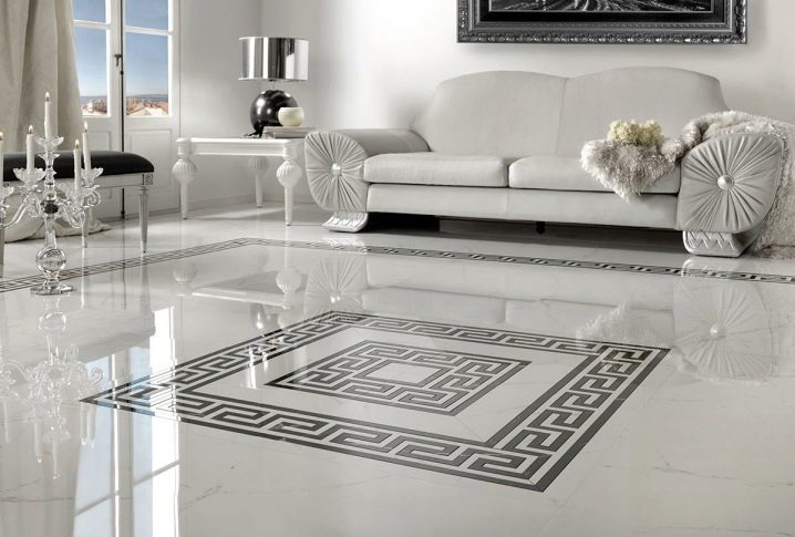 غالبًا ما ينصح المصممون بتزيين غرف المعيشة ببلاط فيرساتشي الأبيض. في الوقت نفسه ، فإن وجود أنماط سوداء كبيرة تقع في منتصف المساحة وعلى طول محيطها أمر مقبول تمامًا. لكن من المهم أن نلاحظ ذلك لهذا النوع من الألوان من التصميم ، فإن الأثاث والجدران ذات الظلال المتشابهة هي الأنسب: أبيض ، رمادي فاتح ، بيج.