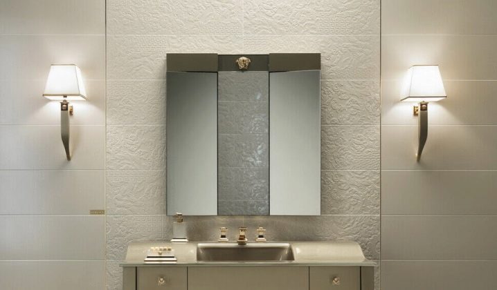 بالنسبة للحمامات ، يعد بلاط Versace بظلال الباستيل الفاتحة خيارًا شائعًا إلى حد ما. سيكون إضافة ممتازة لهذا التصميم نمطًا صغيرًا مغطى بالطلاء الذهبي. لا يمكن قطع جميع الطلاءات بمثل هذه الزخرفة ، ولكن بجزء معين فقط ، حتى لا تفرط في تحميل التصميم..