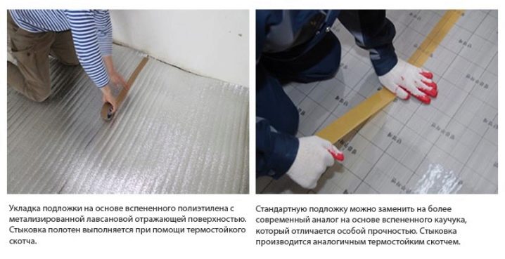 انتبه أكثر إلى الركيزة أيضًا. اختياره مهم للغاية عند تركيب أرضية دافئة. يمكنه معادلة الضغط على الأقفال التي تربط الصفائح وتقليل الحمل عليها عند المشي. يجب وضع الركيزة على فيلم التدفئة تحت الأرضية. كما يسمح لك بتقديم توحيد التدفئة. يجب أيضًا اختيار الفيلم بمسؤولية وحذر شديد. يمكن وضع طبقة أساسية محددة فقط على أرضية الفيلم. لذلك ، الفلين التقني ، رغوة البوليسترين المبثوقة ، المواد ذات الأسطح العاكسة ، أنظمة المركبات السائلة مثالية لهذا الغرض..