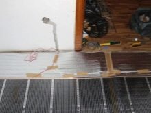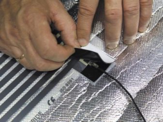 لذلك ، من الأفضل محاذاة الفيلم في مكان وضع وإصلاح حافة الركيزة مع الجانب المقابل لمنظم درجة الحرارة. ثم تحتاج إلى لحام الأسلاك التي تربط أجزاء مختلفة من أرضية فيلم الأشعة تحت الحمراء. بعد طي الفيلم في الجزء حيث تم تثبيت منظم درجة الحرارة ، يجب طيه مع الجانب الخطأ لأعلى. يمكنك إصلاحه مؤقتًا في هذا الوضع بشريط لاصق..