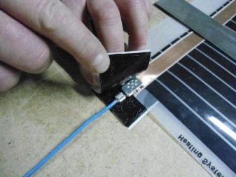 بعد ذلك ، تابع تركيب مستشعر درجة حرارة الأرضية. يجب تثبيت هذا الجهاز تحت الفيلم في أخاديد خاصة. يتم تثبيت المستشعرات الحرارية في أكثر الأماكن دفئًا في أرضية الأشعة تحت الحمراء ، وهي الجزء المركزي للفيلم. بهذه الطريقة ، يمكن تجنب ارتفاع درجة حرارة الأرضية بأكملها. يحتوي مستشعر درجة الحرارة على سلك في منظم الحرارة. هناك يجب أن يتم تثبيته بشريط خاص. ثم يجب عليك نزع الأسلاك وتوصيلها. بعد ذلك ، تحتاج إلى توصيل حافلات التأريض ، ومن المهم تجريدها وتقويضها وتوصيلها بكابل.
