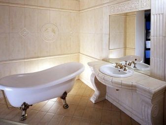 - من أجل ترتيب الحمامات والحمامات ، طور المصممون الألمان صفائح على شكل بلاط ، مما يعطي إحساسًا كاملاً بسطح الأرضية المكسوة بالبلاط. الميزة الرئيسية التي تميز الألواح المصفحة عن البلاط هي الحماية من الحرارة. هناك عدة أنواع من هذا الطلاء: