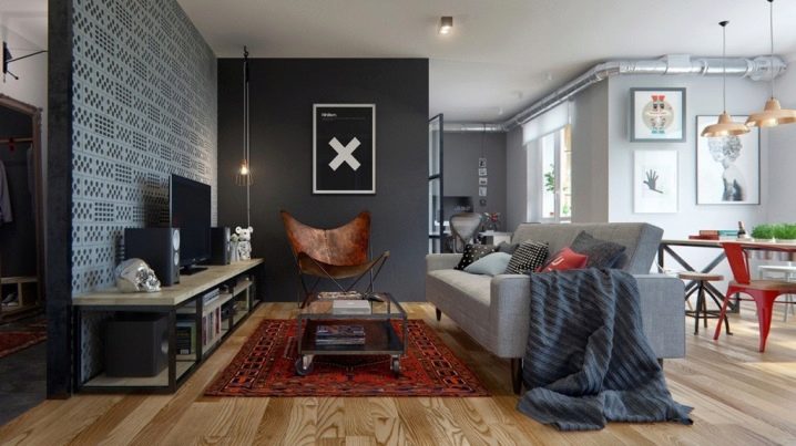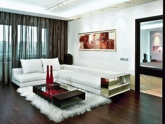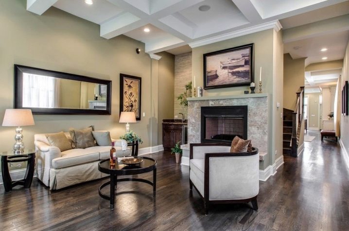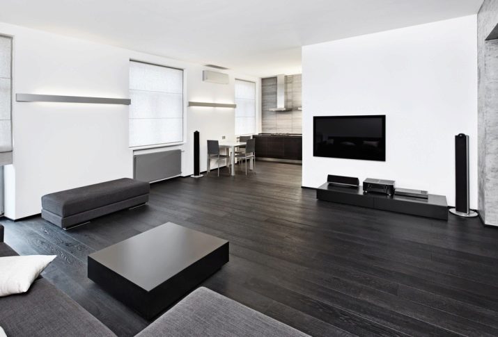 ستبدو أرضية غرفة المعيشة ، المزينة بطريقة حديثة ، أكثر جاذبية إذا كنت تستخدم الألواح بلونين متعاكسين في وقت واحد..