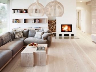 عندما يتم اختيار النمط الاسكندنافي للغرفة بأكملها ، فمن المنطقي أن تفضل اللون الأبيض أو أي ظل آخر فاتح جدًا للأرضية. في أسلوب البلد ، يعد تقليد ألوان أنواع الخشب باهظة الثمن (ولكن ليس غريبًا ، ولكنه ينمو في بلدنا) مناسبًا.