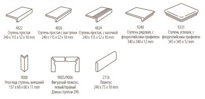 يعتبر الرائد في هذا المجال ستروهير. يتم تقديم مجموعة متنوعة من الخطوات في التعديلات التالية: المنتجات المحدبة والمستطيلة ، والمنتجات الفلورنسية ، والعناصر المحززة. يتراوح لون البلاط من البني إلى الرمادي الداكن. الخصائص المضادة للانزلاق متأصلة في المنتجات ، والتي يتم استخدامها غالبًا في الفناء وفي المناطق المفتوحة..