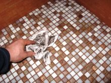 - نبلل الإسفنج في وعاء بالماء ونغسل اللحامات ، الشيء الرئيسي هو عدم الوصول إلى نهاية التماس. يتم ذلك حتى لا تبلل البلاط الذي لا يزال جافًا وغير معالج ، حيث يجب أن يكون جافًا..