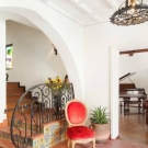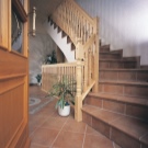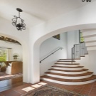 يمكن للبلاط الأبيض في مواجهة الدرج الداخلي أن يحول الجزء الداخلي من القاعة إلى درجة لا يمكن التعرف عليها. سارت الامور بشكل جيد مع المواد الطبيعية – الخشب والحجر والزجاج.