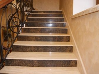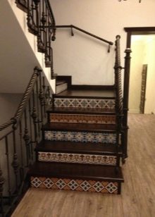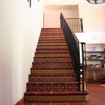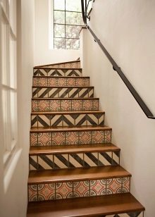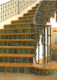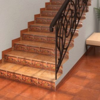 لكسوة الهياكل الداخلية ، استخدم بلاط السيراميك. عادة ما يأخذون نماذج مع قطع خاصة على طول الحواف أو حافة مجعدة. تشبه هذه المنتجات ظاهريًا الخزف الحجري ، ولكن بمساعدتهم ، من المستحيل عمل طلاء متآلف. لكن الجمع بين عدة ظلال لمواجهة الدرج يجعل الهيكل بأكمله مذهلاً..