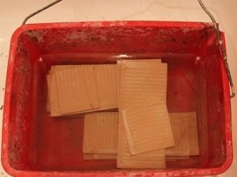 قبل الانتهاء من العمل ، يوصى بغمر مادة البلاط لفترة وجيزة في الماء لتحسين الالتصاق بالغراء. إذا اشتريت مسحوق الغراء ، فقبل الشروع في البطانة ، يجب عليك تحضير المحلول وفقًا للتعليمات الموجودة على العبوة..