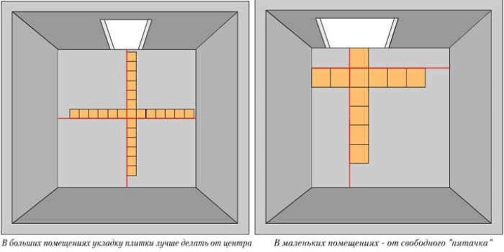 تحتاج إلى البدء في وضع البلاط من المكان الذي تتقاطع فيه المحاور التوجيهية. يجب أن تلتصق المنتجات بإحكام شديد مع بعضها البعض. عند تثبيت أرضيات بلاطة خالية ، يمكن استخدام الغراء.