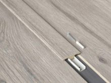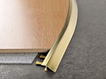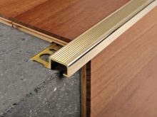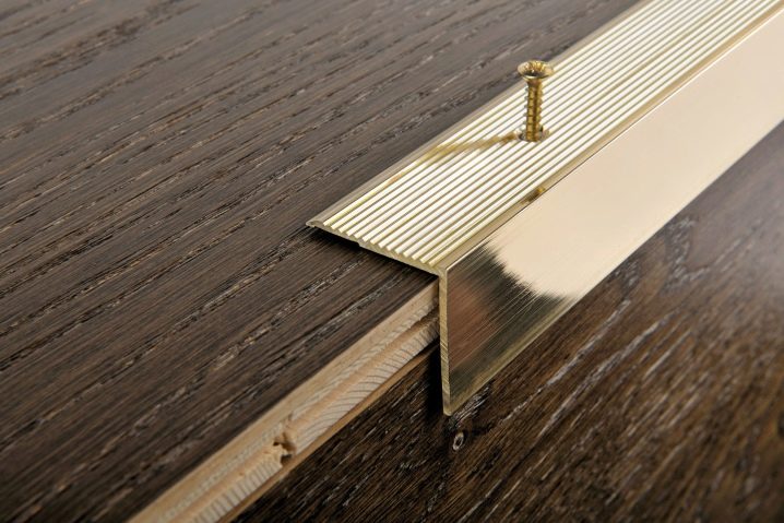 - ركن. غالبًا ما تستخدم الأرضيات المصفحة في مواجهة السلالم ، وفي هذه الحالة ، تكون شرائط الزاوية في متناول اليد. إنها مصنوعة من المعدن أو الخشب أو MDF وتحمي الأرضيات من التآكل والأوساخ والانزلاق المفرط. يتم تثبيت هذه الأجزاء بطريقة قياسية: مفتوحة أو مغلقة. مع التثبيت غير المعزول ، يتم تثبيت الزوايا بالأجهزة ، وعند الإغلاق – بحواف مساعدة ذات شكل خاص ؛