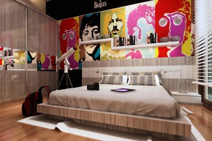 عندما يتم اختياره لتزيين الغرفة فن البوب, تحتاج إلى إظهار أقصى قدر من الإبداع ، حاول أن تفاجئ بجرأة ونضارة الفكرة. تتشابك الظلال المختلفة باللونين الأزرق والأخضر بشكل عضوي مع التصميم المتميز للأرضية والسقف والأثاث.