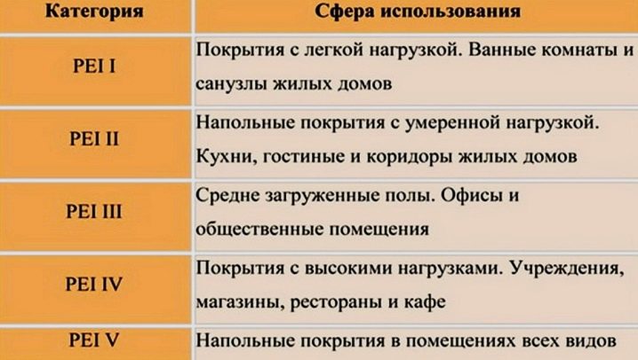 تقاس مقاومة التآكل للسيراميك المصقول على مقياس من خمس درجات رئيسية تسمى PEI. للاستخدام في الغرف التي يتحركون فيها بكثافة متوسطة وفي الأحذية العادية ، وكذلك التي لا تلامس الشارع ، يتم استخدام بلاط من الفئة 3 على هذا المقياس. إنه مخصص لجميع مناطق الشقة أو المنزل الخاص ويمكن استخدامه في مباني المكاتب الصغيرة أو الفنادق..