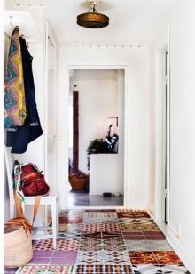بفضل الموضة المغربية ، أصبح البلاط الأسمنتي جزءًا لا يتجزأ من المناطق الداخلية للعديد من المنازل. تبدو هذه النهاية رائعة على الأرضية في الردهة مع وحدة تحكم ومرآة جميلة. إناء من الزهور بأسلوب شرقي سيكون إضافة رائعة للتكوين.